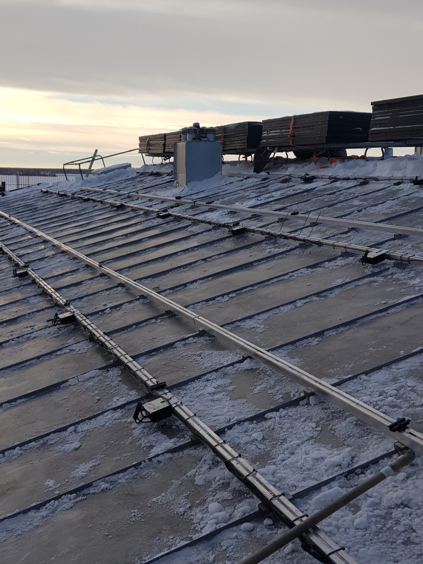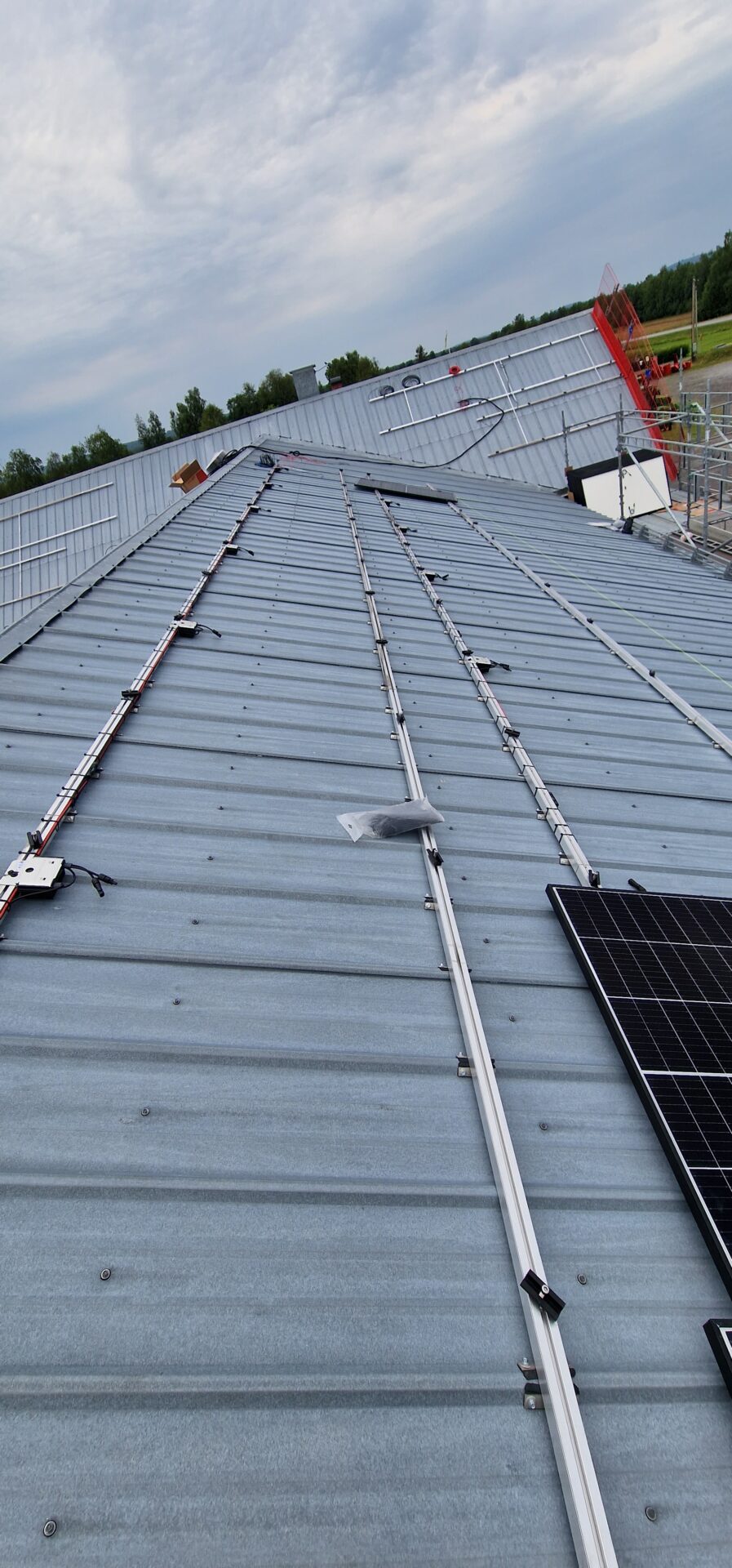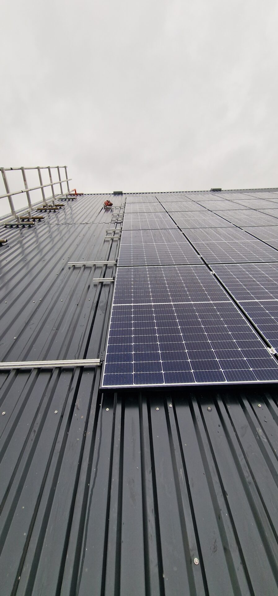 Solární panely jsou připevněny k montážním rámům, které jsou pevně spojeny s vlnitým plechem.