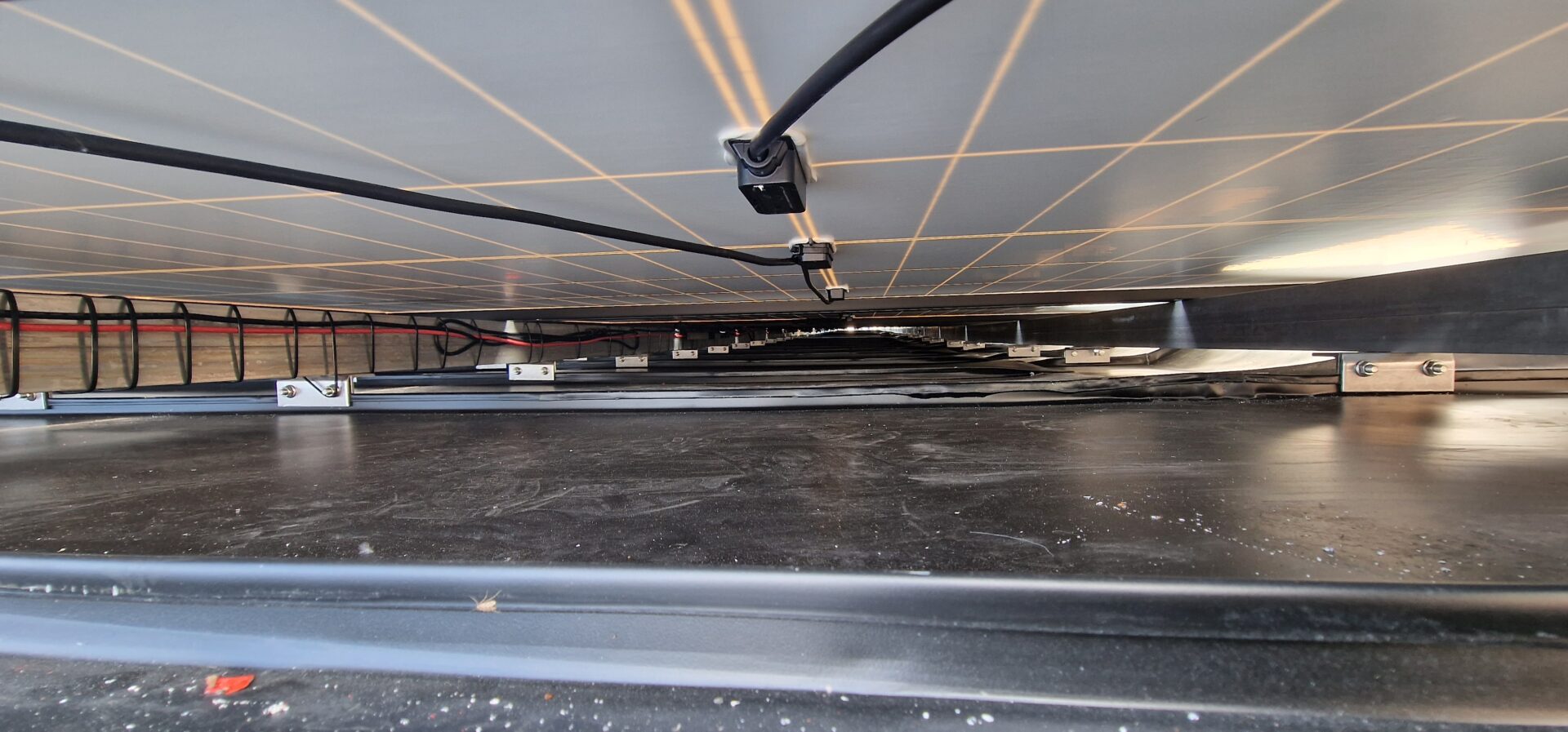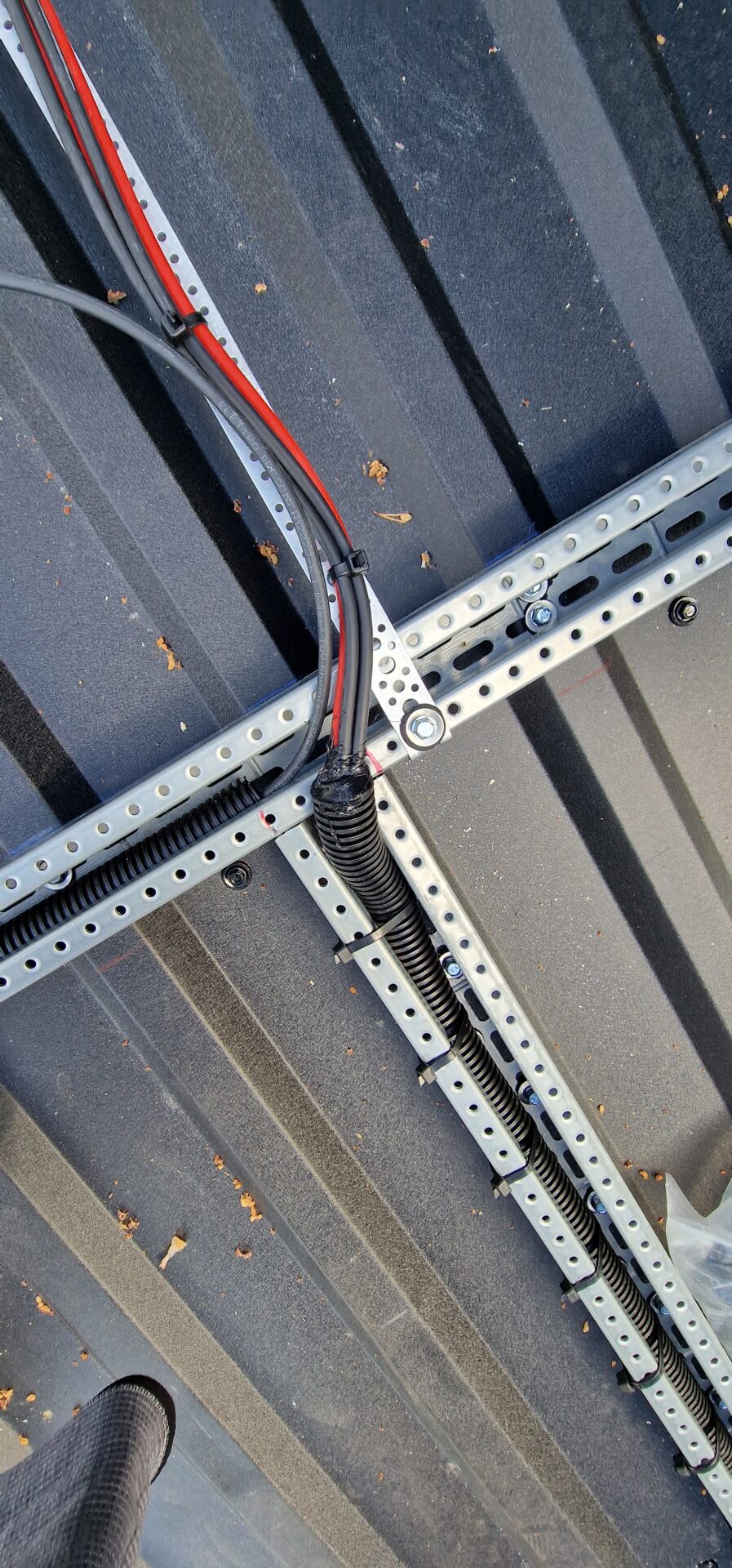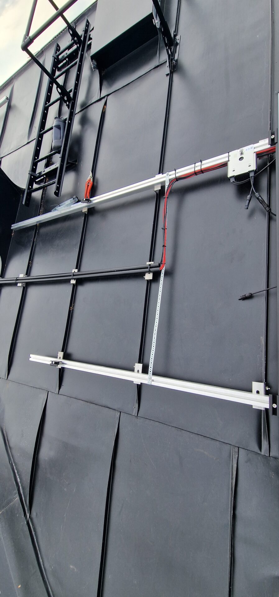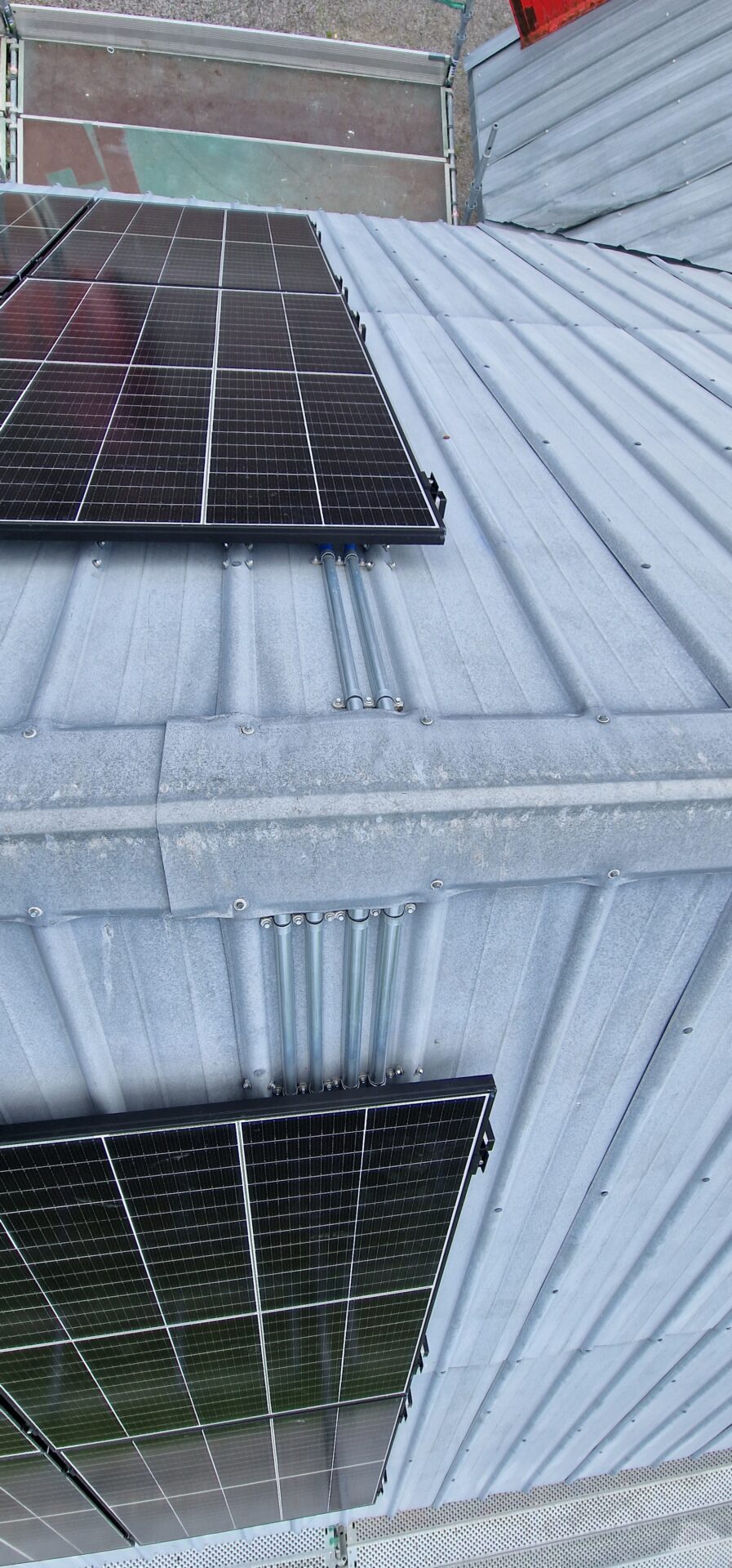 Solární panely jsou připevněny k montážním rámům, které jsou pevně spojeny s vlnitým plechem.